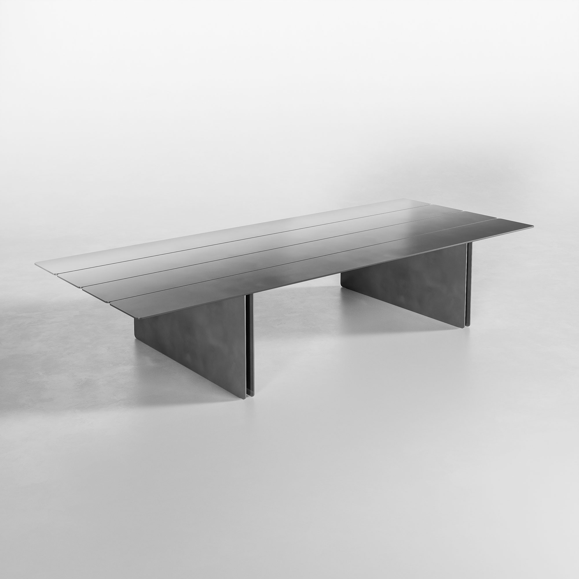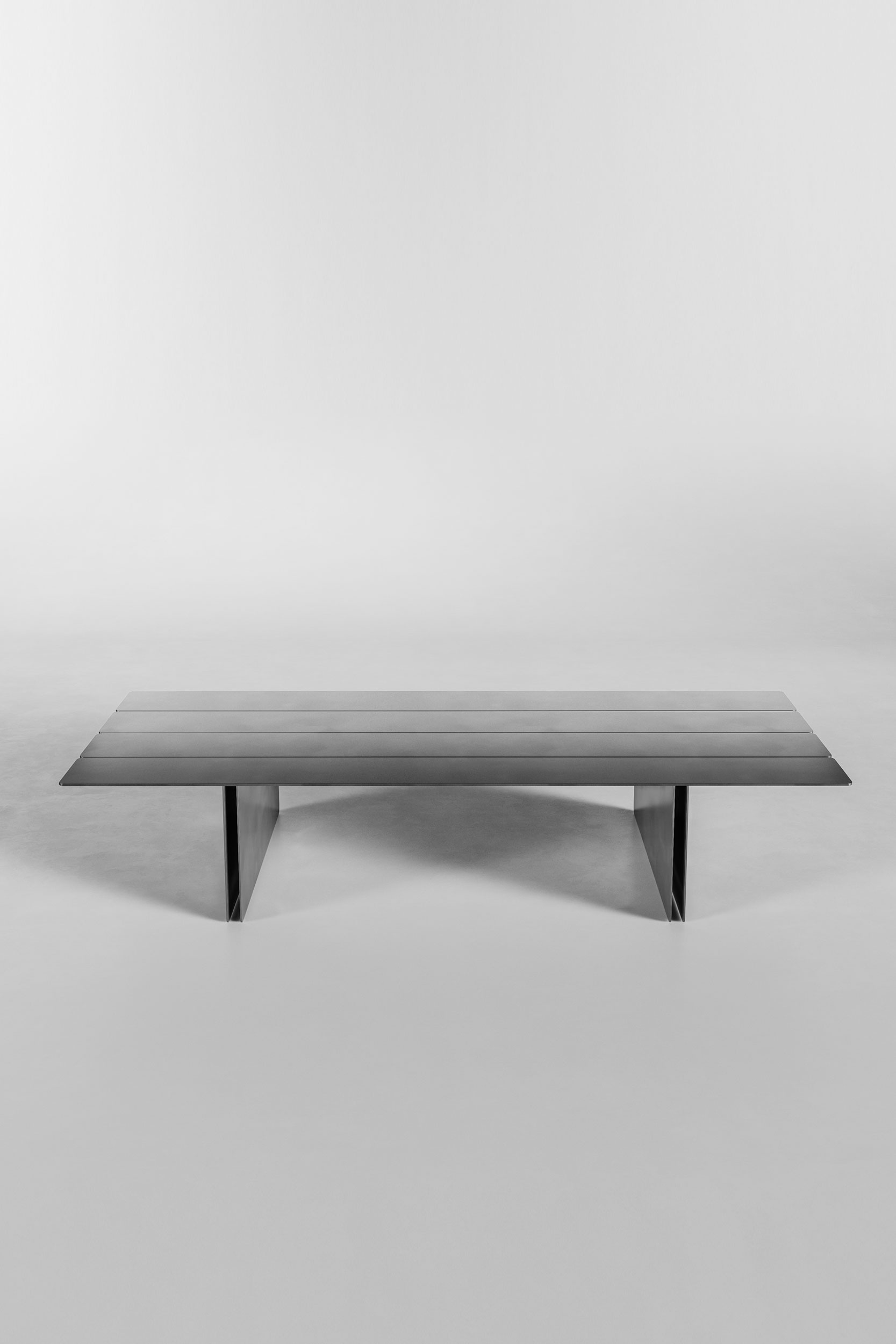 KANJI table, a designer piece in stainless steel or patinated brass with a clear modular form and a fine 3 millimeter gap for subtle light reflections